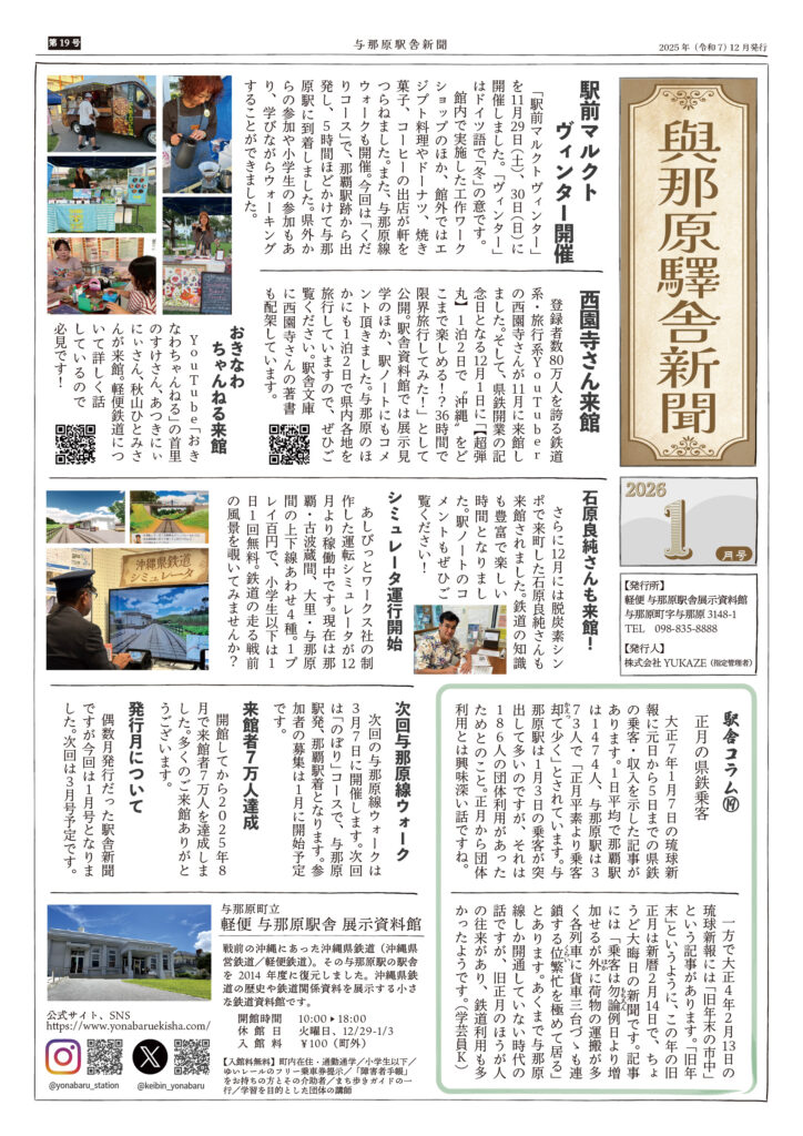 与那原駅舎新聞1月号を発行しました与那原駅舎新聞1月号を発行しました。与那原駅舎展示資料館および町内各区の掲示板のほか、PDF版もご覧いただけます。PDF版→駅舎新聞2026年1月号(2.1MB)駅前マルクトのレポートやYouTubeなどの情報を掲載して… -