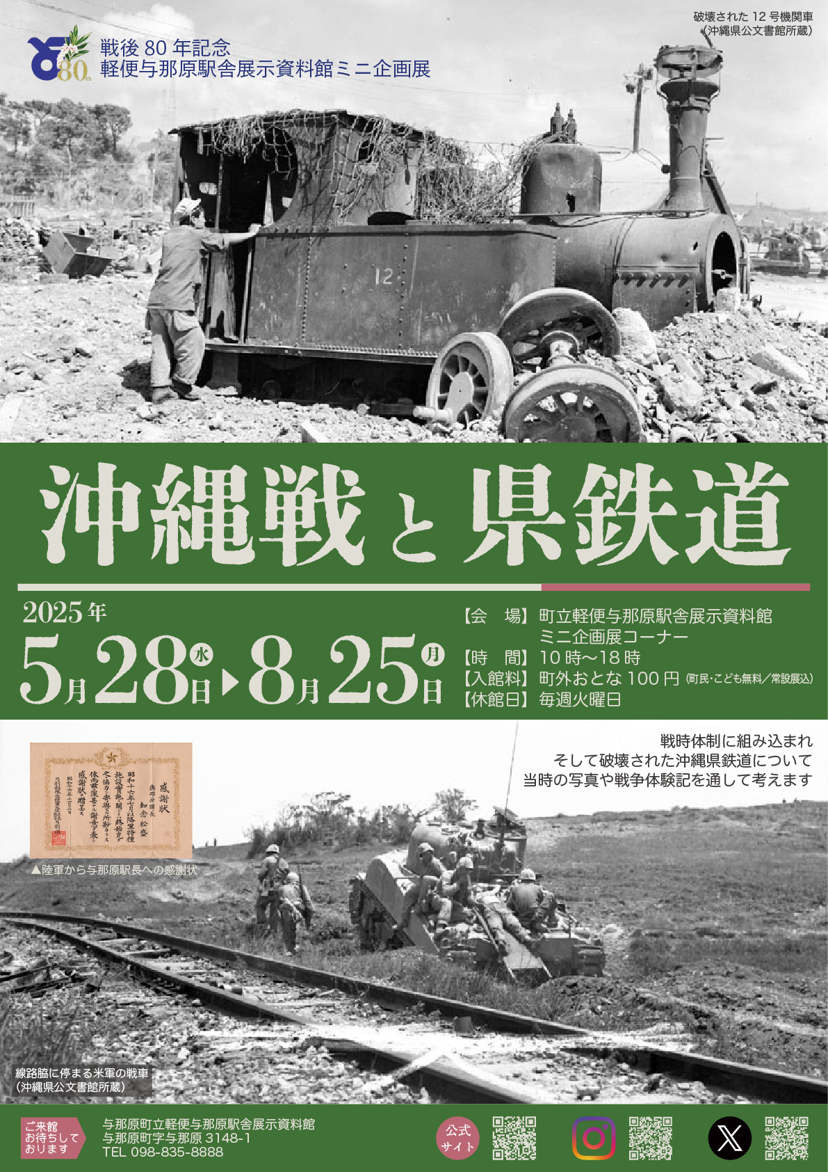 2025(令和7)年は戦後80年の節目の年となります。そしてそれは当館がテーマとする沖縄県鉄道が沖縄戦で破壊され、運行が停止してから80年が経過したことになります。
