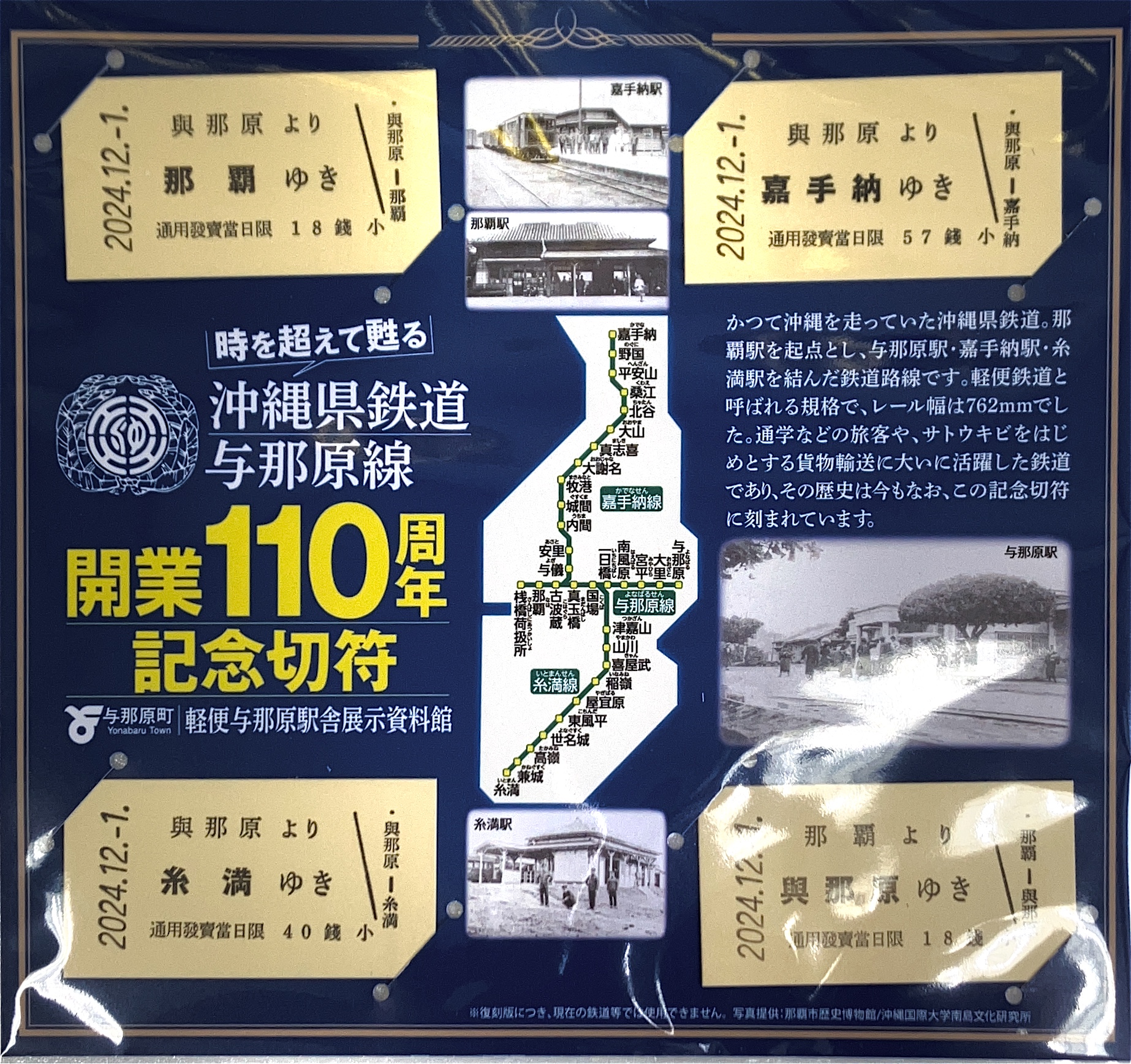 当時の切符を再現した硬券セット。なんと、実際の硬券を印刷する会社に作ってもらっています!与那原から各路線の終点行きと、那覇から与那原行きの計4枚です。